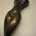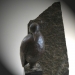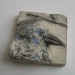 een kleine tegel met daarop het portret van een raaf.